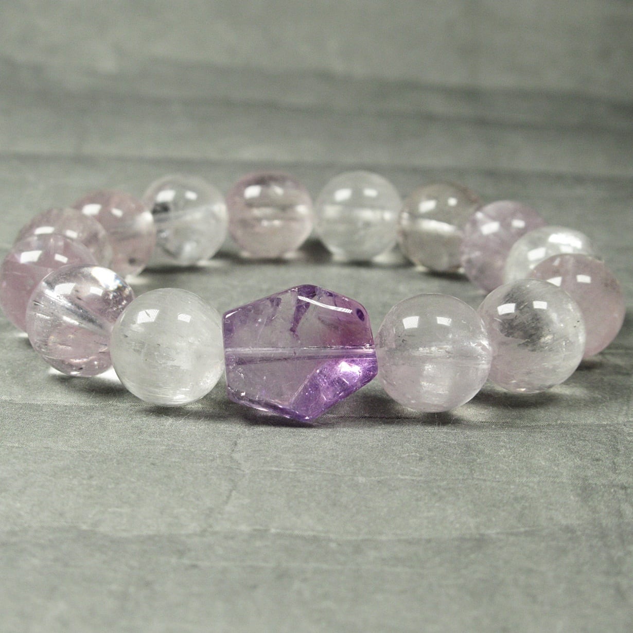 サイズ:クンツァイト12mm×14個 アメジスト10mm×1個 内周15cm