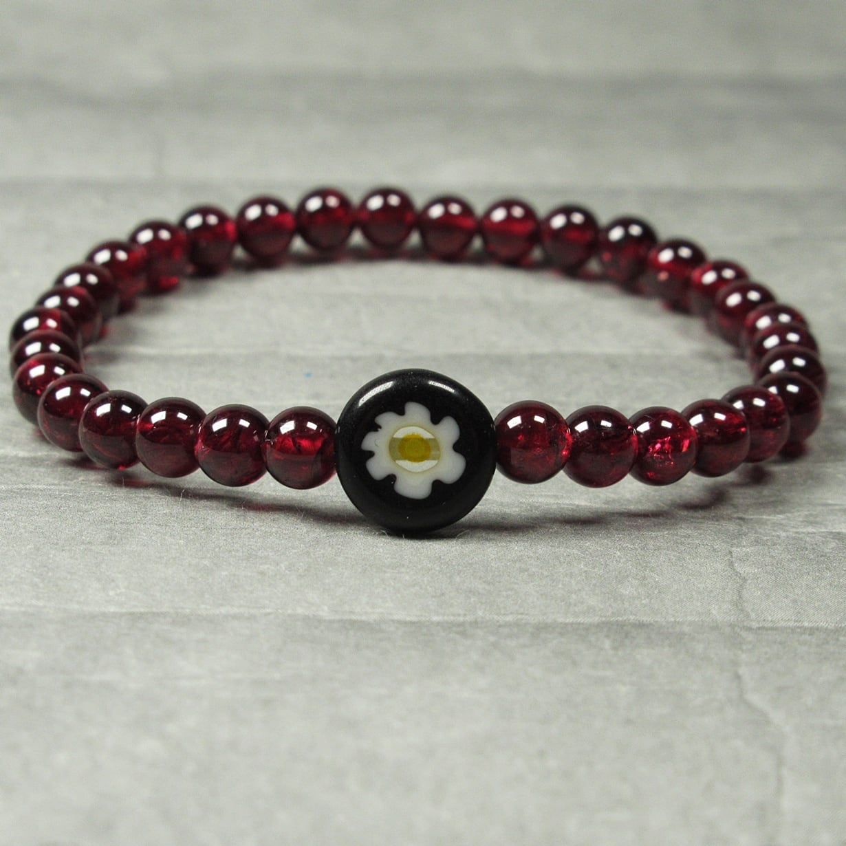 深いワインレッドのガーネットとブラックのミルフィオリビーズ。シックなブレスレット西上がりました。洗練された印象を与えます。