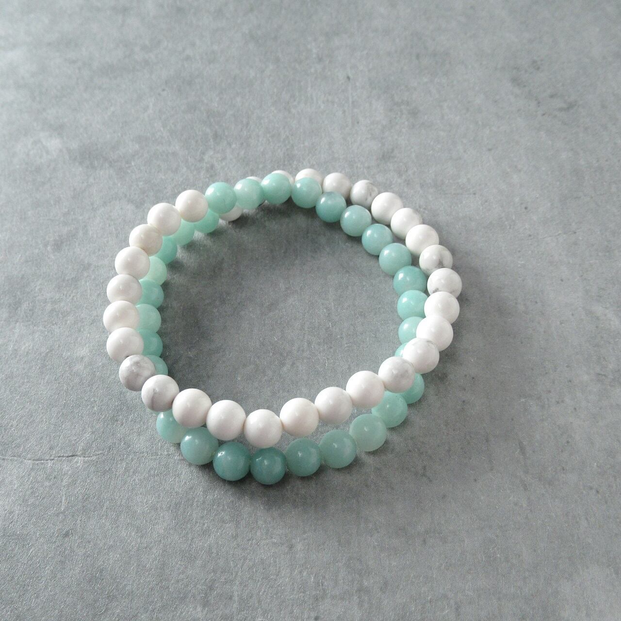 商品番号:BR-AMA-027 サイズ:6mm アマゾナイト・ハウライト各30pc 内周15cm 重さ:19g 淡いブルーのアマゾナイトとホワイトのハウライトを半々に2連のブレスに仕上げました。ゴムで組んでいるので直脱は簡単。爽やかな明るいモードになりそうなコンビネーションです。 アマゾナイトは、「希望」を信じられるようにしてくれる石、ハウライトは、手にしていると安らぎを与えてくれる石と言われています。