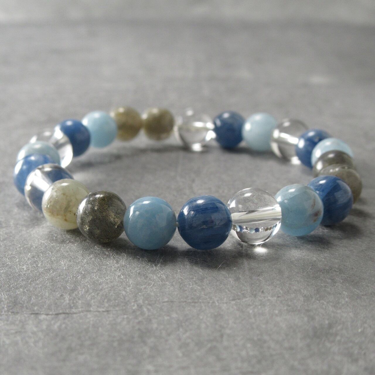 製品番号:BR-KYA-045 サイズ:カイヤナイト8mm ラブラドライト8mm アクアマリン8mm ムーンストーン8mm 水晶8mm 内周15.5cm 重さ:18g カイヤナイトは無意識と意識を繫ぐ石、ラブラドライトは直感力を高める石と言われています。 想像力やひらめきを大切にしたいときに、おすすめします。